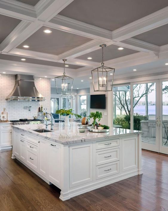 La última cocina que quiero presentarte es, probablemente la más lujosa de este artículo. Esta característica viene dada por las dos islas pequeñas que hay en el centro de la cocina. Se trata de una cocina muy moderna con muebles blancos y decoración minimalista; sin embargo, cuando nos fijamos bien, podemos detectar un guiño al diseño rústico, que se transmite con elementos, como por ejemplo las vigas del techo.